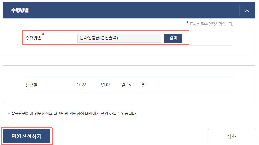 ⑦ 모든 정보가 체크가 완료되었으면 수령방법에서 원하는 방법을 선택한 후, 민원 신청하기 버튼을 눌러줍니다.