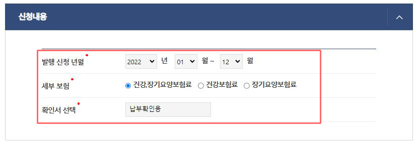 그 후, 발행 신청 년월 및 서류 출력이 필요한 보험 유형을 선택하여 줍니다.