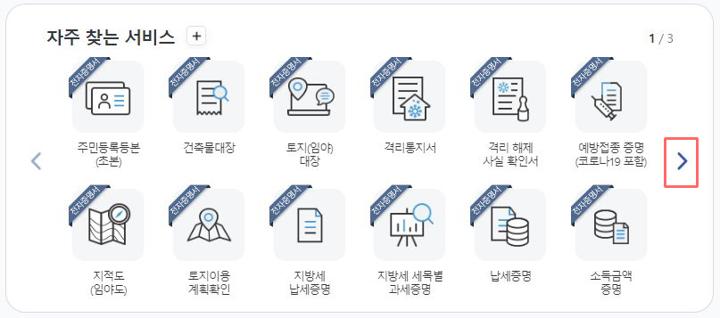 ③ 로그인이 완료되면 메인 페이지로 자동 접속되는데, 이때 '자주 찾는 서비스' 오른쪽 화살표 버튼을 눌러