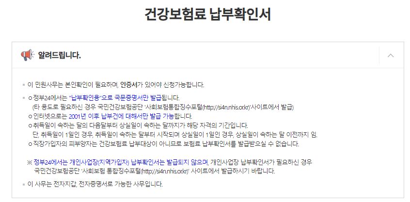 ※ 정부 24에서는 납부 확인용으로만 출력이 가능하며, 그 외 용도로 출력이 필요하신 경우 국민건강보험 공단 사이트를 이용하셔야 합니다.