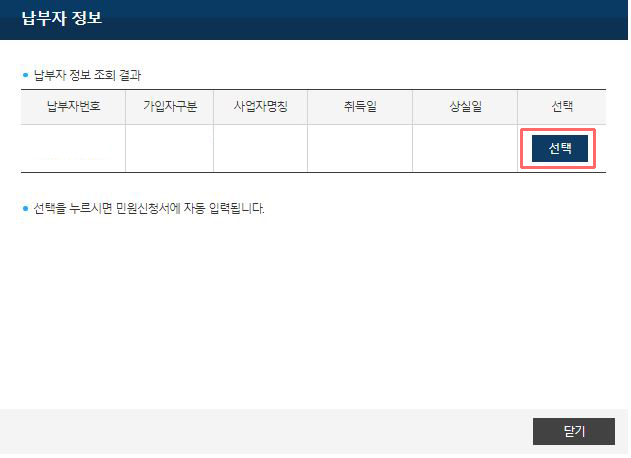 ⑧ 민원 신청하기 버튼을 누를 경우 납부자 정보와 함께 사업자별로 납부 내역이 뜨는데, 이때 출력을 원하는 직장명을 클릭합니다.