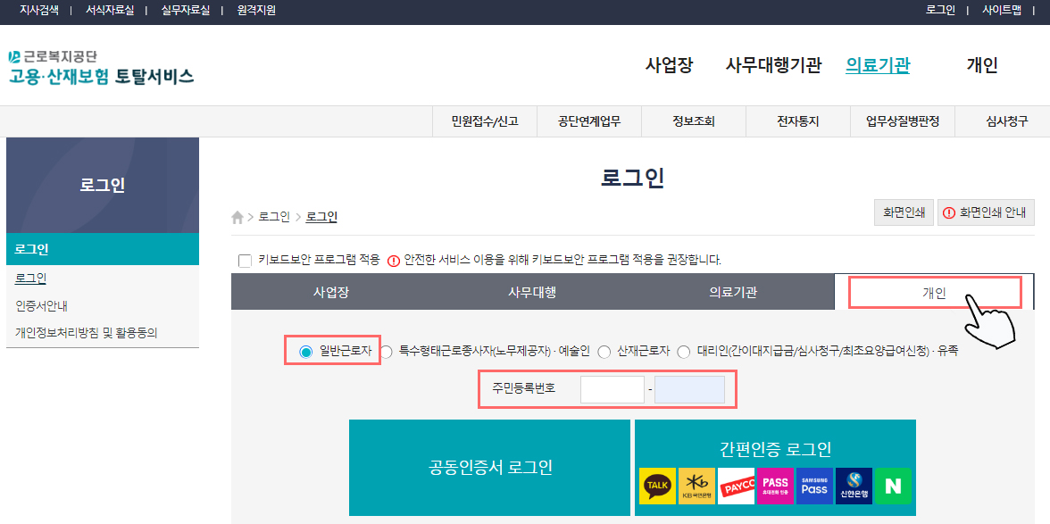 ② 로그인 화면에서 '개인' 선택 > '일반 근로자' 선택 후, 주민등록번호 입력을 하고 공인인증서 또는 간편 인 증으로 로그인을 합니다.