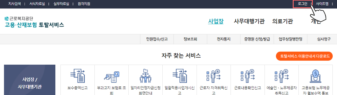 ① 먼저, 근로복지공단 고용·산재보험 토털 서비스 사이트로 접속합니다.