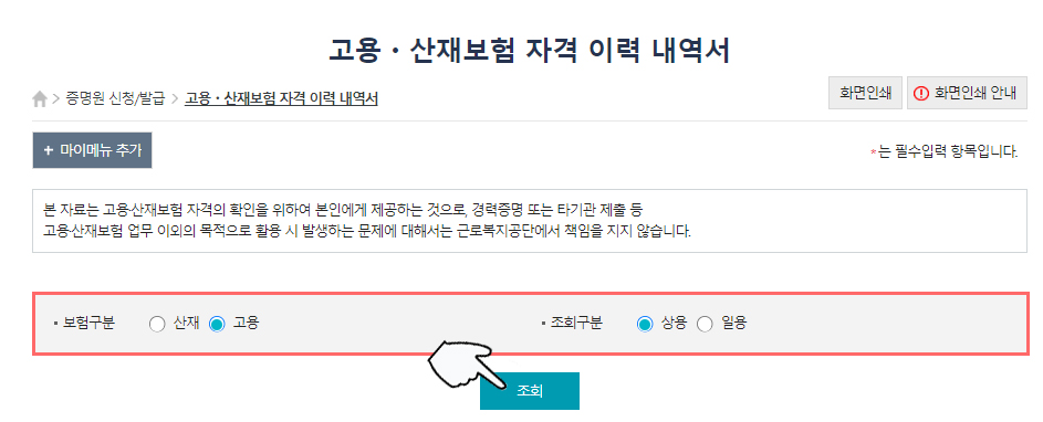 ④ 보험 구분 중 '고용' 선택, 조회 구분 중 '상용' 선택을 하고 조회 버튼을 눌러줍니다.