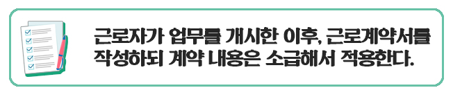 - 쉽게 말하자면, "일단 출근해서 며칠 일한 뒤에 계약서 작성할게요~"인데, 근무 시작 전 근로계약서를 작성하지 않으면 무조건 불법 (근로계약서 미교부+미작성)