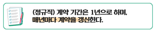 - 매년 연봉협상을 위해 다시 작성하는 것은 상관없으나, 정규직으로 채용했다면 '계약의 정함이 없는' 근로계약서를 작성해야 한다.