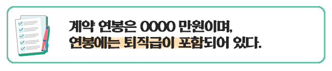 - 연봉을 12로 나눠서 거기에 퇴직금을 포함시키는 것은 불법이기 때문에 근로계약서에 적힌 내용과 무관하게 퇴사 후에 퇴직금을 요구할 수 있다.