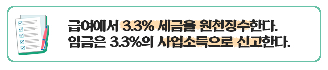 - 급여에 사업소득 3.3%를 적용하는 것은 근로자가 아니라 프리랜서로 계약을 진행하는 것! 법적으로 따지면 사업주와 동업 관계로 간주한다.