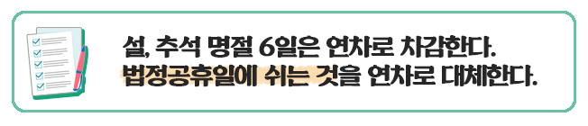 - 2022년부터 5인 이상 사업장은 근로자와 합의를 했다고 하더라도 법정공휴일을 연차로 대체하면 최대 2천만 원까지의 벌금이 부과된다.