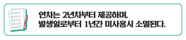 - 1년 미만 근로자는 1개월 만근 시 다음 달에 연차 1개씩 부과, 다음 해 사용할 연차를 당겨서 사용하라고 하는 것은 불법이다.