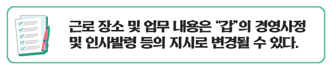 - 근로 장소와 업무 내용이 명확하게 기재되어 있다면 변경할 때 동의가 필요하므로 계약서에 포함해달라고 요구하는 것이 좋다.