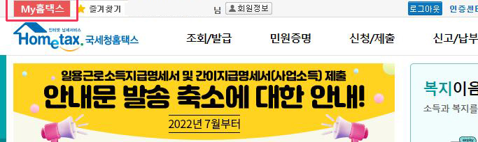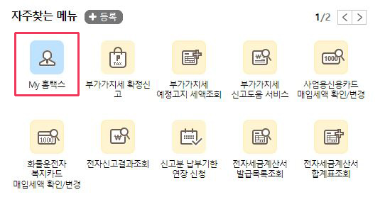사이트 중간, 자주 찾는 메뉴 'MY 홈택스' 중 선택하여 접속합니다.
