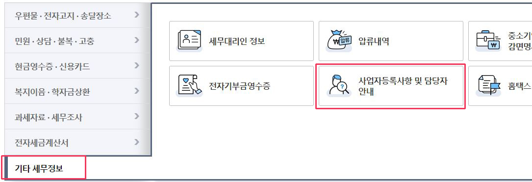④ MY 홈텍스로 접속 후, 하단 메뉴 중 기타 세무 정보를 클릭하고, 사업자등록사항 및 담당자 안내 메뉴로 접속합니다.