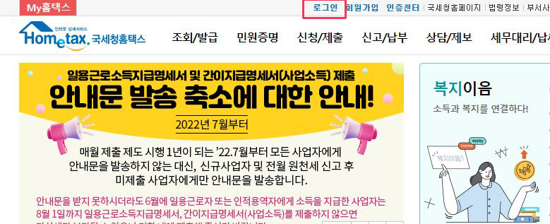 ① 먼저 홈택스로 접속 후, 상단 로그인 버튼을 눌러줍니다.