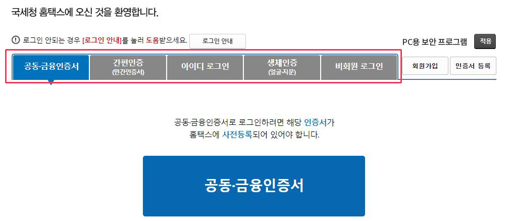 ② 로그인 방법 중 공동·금융 인증서 선택 후 사업자 명의로 된 공인인증서로 로그인을 합니다.
